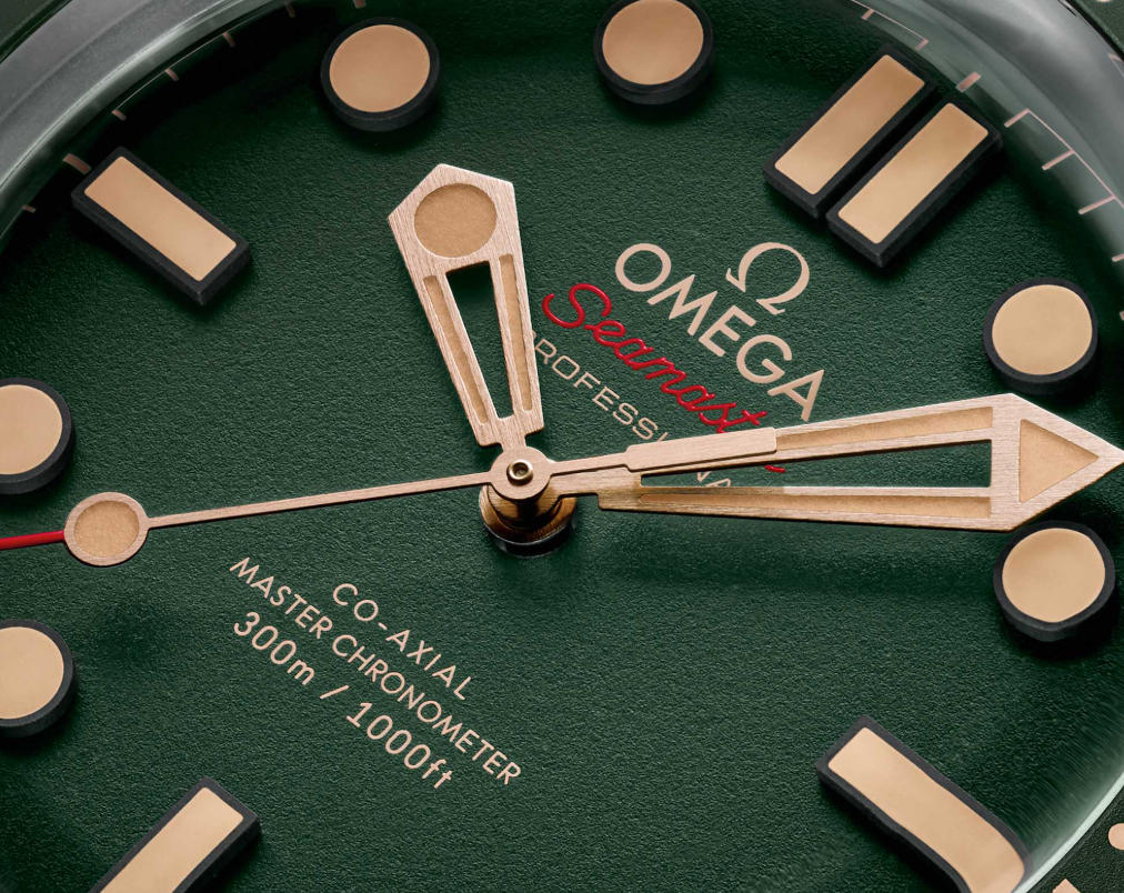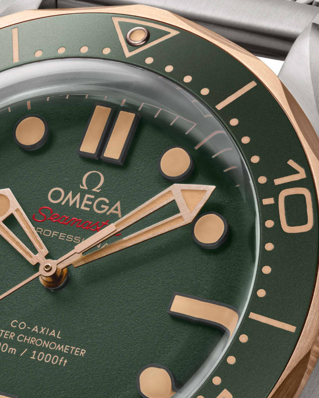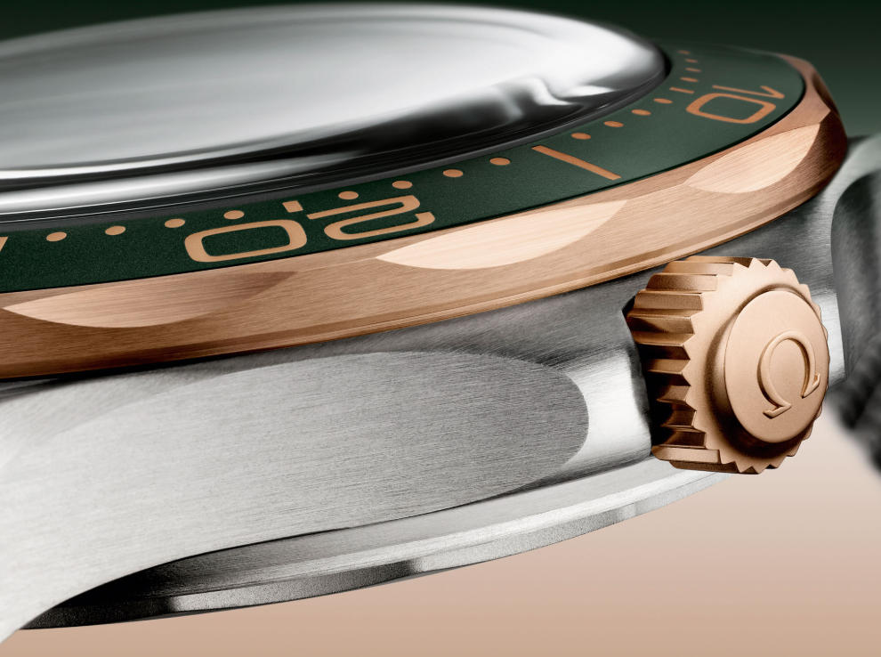 The crown, helium escape valve, and bezel are crafted from top clone Omega watches exclusive Bronze Gold, developed to retain its natural patina over time, without turning green due to layer oxidation. So, if you are one of those who likes to play Victor Frankenstein on their bronze watches, turning them into variably deformed and discolored objects that likely no dermatologist would ever recommend to wear against your skin — you may be out of luck with Bronze Gold. Definite pros include that it is nickel-free, making it anti-allergenic, and iron-free, improving magnetic resistance. The hands are in PVD Bronze Gold, too.